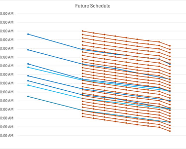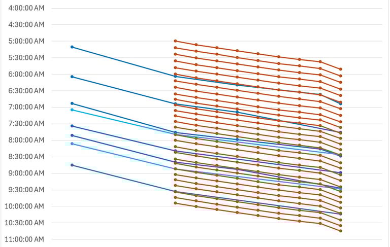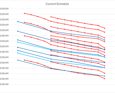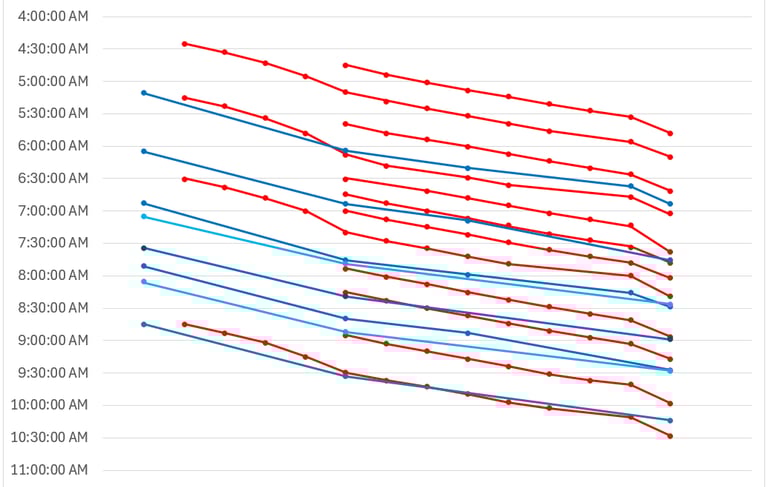 A Typical Wednesday morning schedule on the Northeast Corridor southbound between Wilmington and Baltimore. MARC traffic, shown in red, is slower (steeper) than the Amtrak trains in blue. Most MARC trains wait to be overtaken at Baltimore Penn. Four timed overtakes occur using the limited opportunities on the three track stretch between Baltimore and New Carrollton.